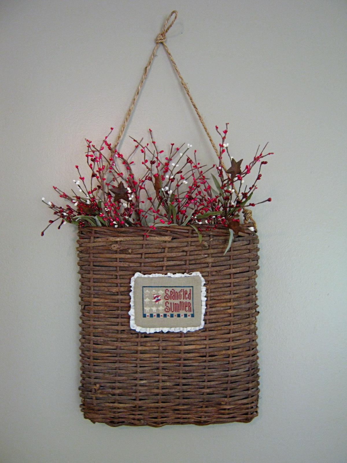 And then I had a thought...didn't I stitch something Americana last summer? Yes, yes I had stitched something, but I never did anything with it. I decided that rather than framing the piece or using it on a pillow, I'd turn it into a little sign to decorate one of my wall baskets.