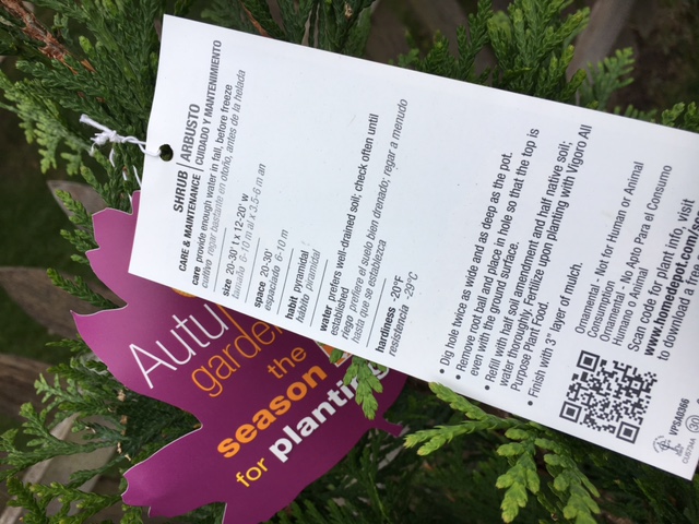 In many areas relating to this house, I am a bargain shopper. I patiently waited for these arbor vitae to go on sale. And finally, they did! Marked down to half off of their original $45 price tag at Home Depot. Yea! We did have to drive to two stores to get the right amount, but in the end we saved quite a bit.